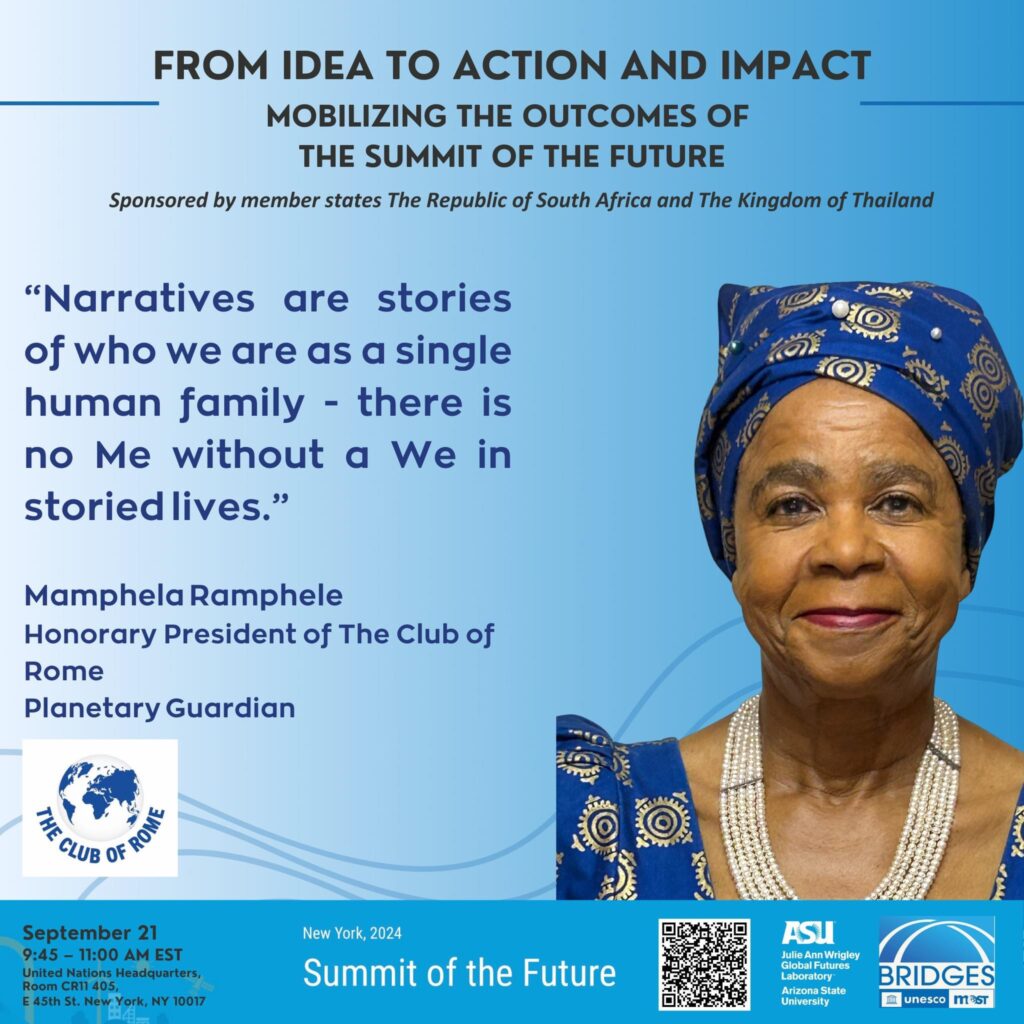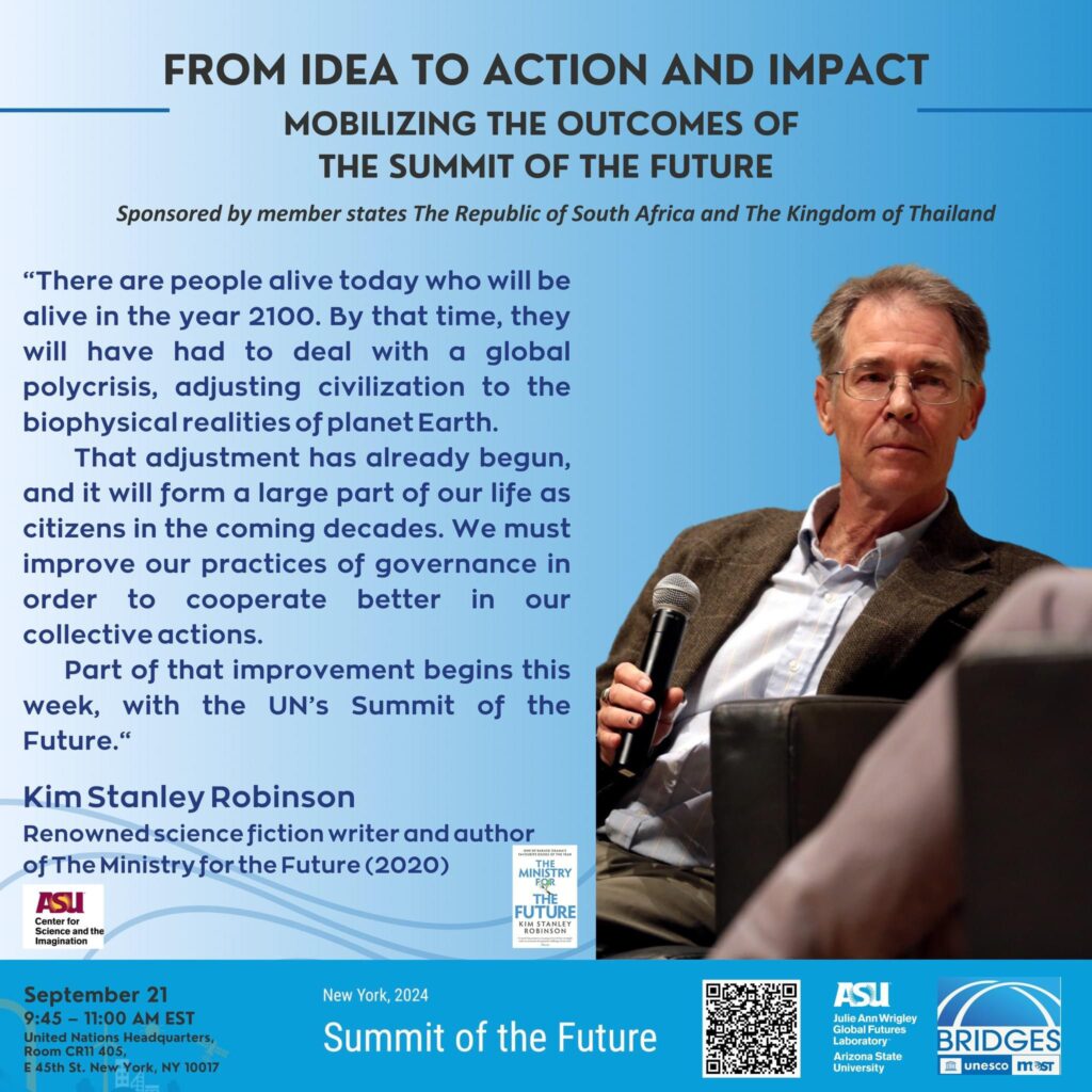 The BRIDGES Flagship positioned our high-level Action Days session for the Summit of the Future in direct relationship with our Wales Hub and the Wales Protocol for Future Generations, using the Futures Generations Commission as a model for how practical frameworks can translate the commitments of the Declaration on Future Generations into action. We noted, too, how the Future Generations Commission is reflected in Stanley’s novel, Ministry for the Future. By aligning fiction and the Protocol, the Flagship’s high-level session demonstrated how global agreements can be operationalized in the imagination, in storytelling, and across multiple scales of governance, from local communities to international collaborations. BRIDGES specializes in modeling such “humanities-led” approaches to governance. Key issues discussed also included the roles of storytelling (highlighted by Kim Stanley Robinson and Mamphela Ramphela), the engagement of indigenous communities, governments, and international collaboration, shaping policies for future generations, balancing urgent and long-term needs, building 21st-century skills, and applying ethical AI.