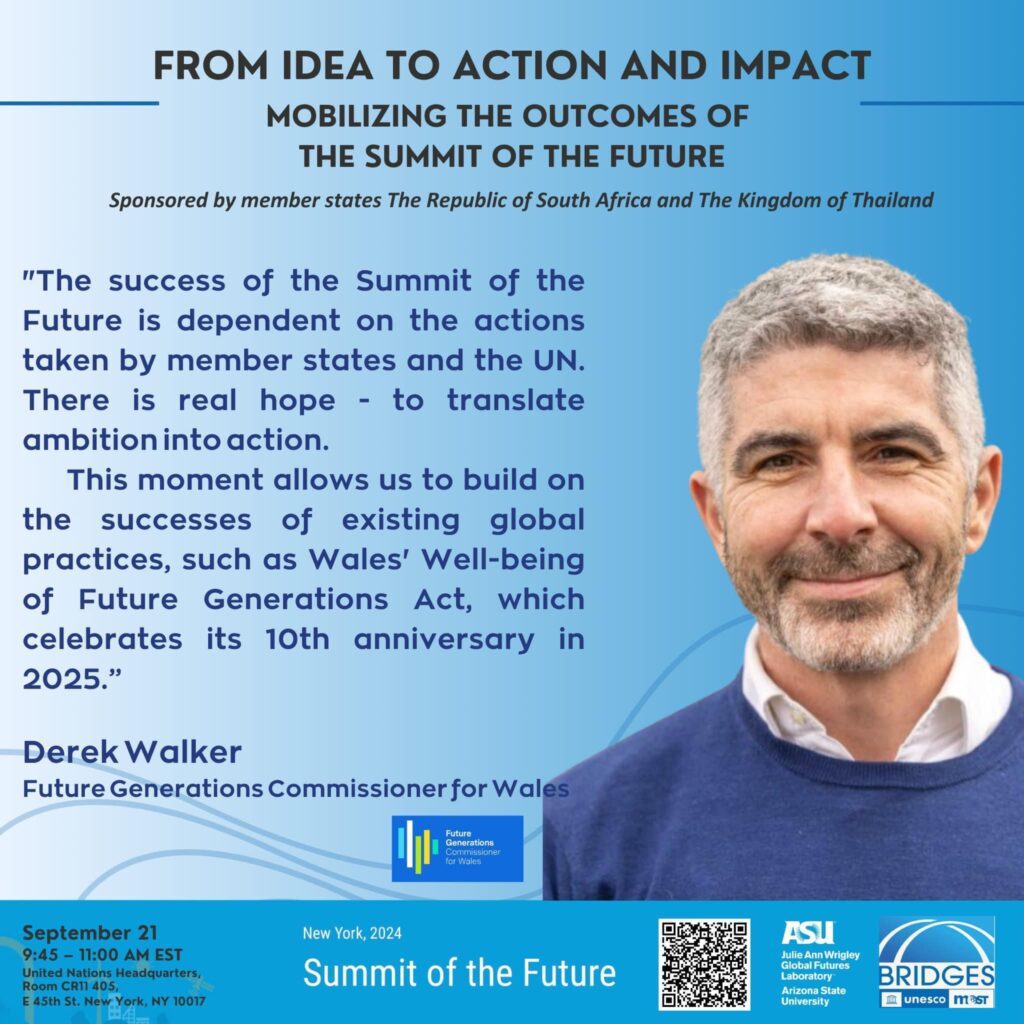 Building on this foundation, further efforts by BRIDGES and its Flagship Hub will extend into late 2024 and early 2025 through consultation workshops and labs in cities worldwide, co-organized with partners including UNESCO, the Office of the Future Generations Commissioner for Wales, ASU’s Global Futures Laboratory, and The Club of Rome, among others. These activities aim to identify effective approaches for implementing the Pact for the Future, the Declaration on Future Generations, and the Global Digital Compact, while expanding a database of demonstration cases to inform policymaking.